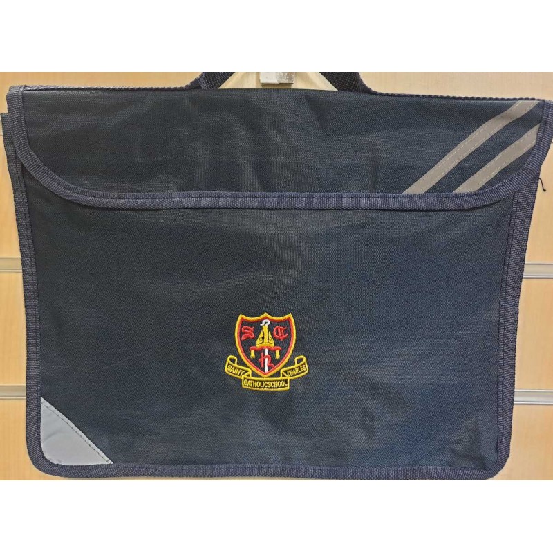Navy book bag with St Charles logo. Featuring a reflective safety feature on the outside and a zip pocket on the inside.
