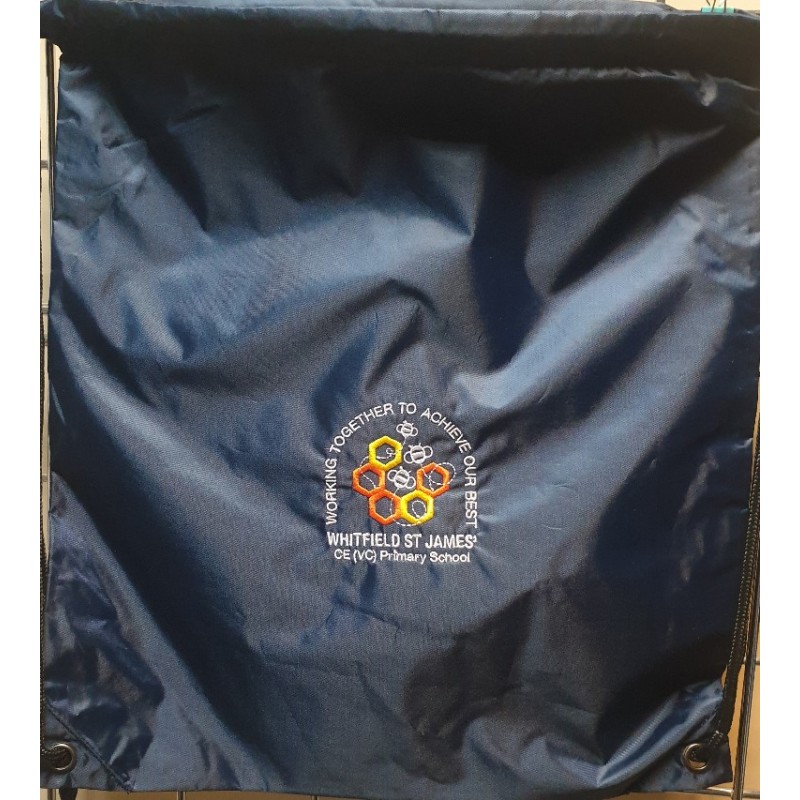 Navy P.E Boot Bag with Whitfield St James Logo. Featuring name tag slot, drawstring handles and made with lightweight material.