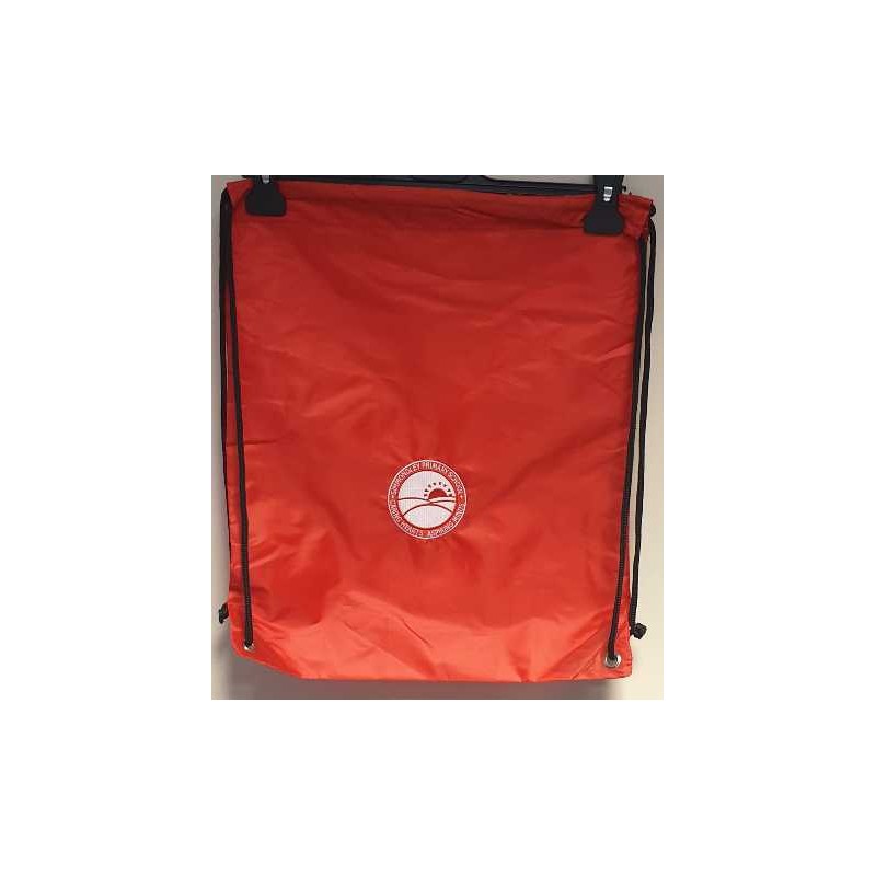 Red P.E Boot Bag with Simmondley Logo. Featuring name tag slot, drawstring handles and made with lightweight material.