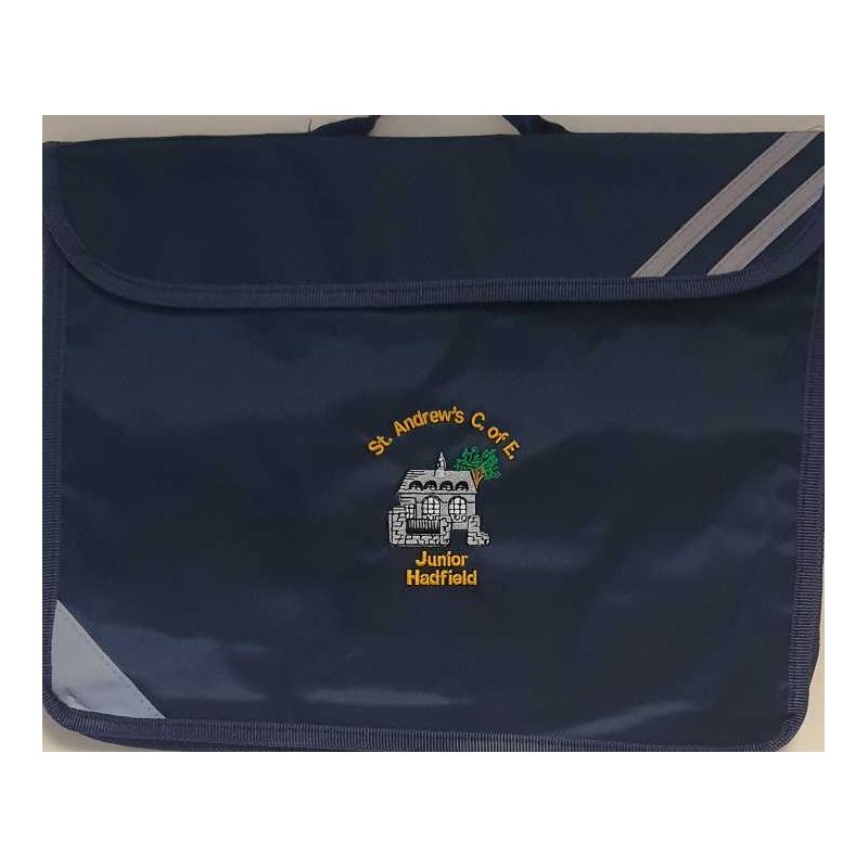 Navy book bag with St Andrews logo. Featuring a reflective safety feature on the outside and a zip pocket on the inside.