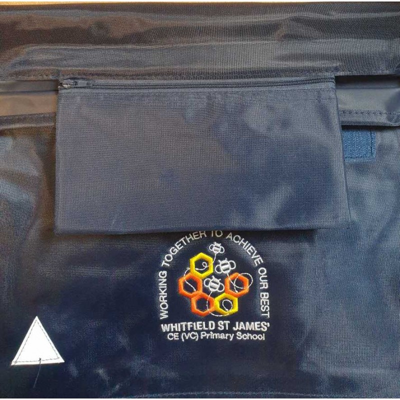 Navy book bag with Whitfield St James logo. Featuring a crossbody strap, name tag slot and reflective safety feature on the outside. Zip pocket on the inside.
