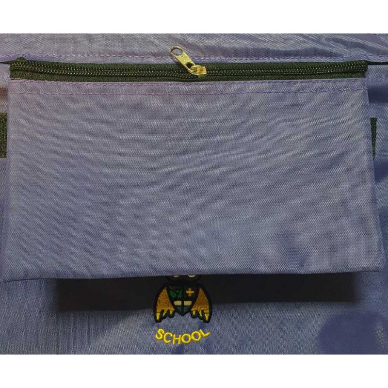 Purple book bag with St Lukes logo. Featuring a crossbody strap, name tag slot and reflective safety feature on the outside. Zip pocket on the inside.